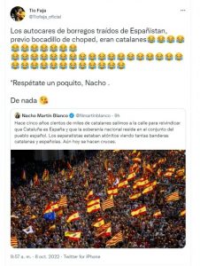 «Los autocares de borregos traídos de Españistan, previo bocadillo de choped, eran catalanes😂😂😂😂😂😂😂😂😂😂😂😂😂😂😂😂😂😂😂😂😂😂😂😂😂😂😂😂😂😂😂😂😂😂😂😂😂😂😂😂😂. Respétate un poquito, Nacho. De nada 😘», ha escrito el colaborador de la SER en su cuenta de Twitter.