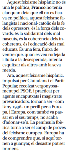 Y concluye con un «la península ibérica vuelve a ser el campo de pruebas del fascismo europeo. Europa ha de comprender que, si aquí vuelven a ganar, el desastre puede ser inmenso». La columna se titula «Feixisme hispànic», y también se puede consultar en la edición electrónica del diario.