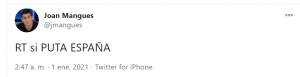 Cada uno elige su manera de empezar el año, pero lo más normal y que hacen el 99% de los mortales es deseando un feliz año a todo el mundo, pero cerebros como los de Mangues deciden arrancar el año insultando a España.