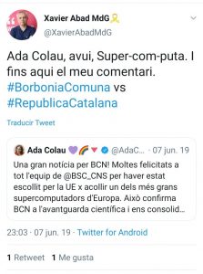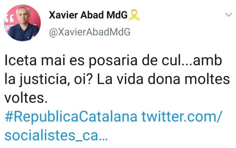 A la alcaldesa de Barcelona le dedica un grave insulto «Ada Colau, hoy, Super-com-puta. Y hasta aquí mi comentario«. A Miquel Iceta también le dedica graves insultos «Iceta nunca se pondría de culo con la justicia verdad? La vida da muchas vueltas«. Además Abad no entiende el por qué hay que contestar a los medios de Madrid.