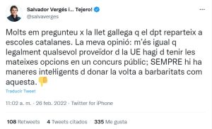 «Muchos me preguntan x la leche gallega q el dpto reparte a escuelas catalanas. Mi opinión: me da igual q legalmente cualquier proveedor de la UE deba tener las mismas opciones en un concurso público; SIEMPRE hay formas inteligentes de dar la vuelta a barbaridades como esta«, ha escrito Vergés en sus redes sociales. El asunto se comenta solo.
