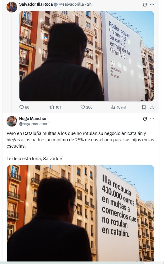 Illa ha compartido en sus redes sociales una foto de esta lona, lo que ha merecido la pronta respuesta de uno de los jóvenes valores del PP en el Parlament, Hugo Manchón. Le contestó al presidente de la Generalitat que «en Cataluña multas a los que no rotulan su negocio en catalán y niegas a los padres un mínimo de 25% de castellano para sus hijos en las escuelas».