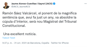 «Ramón Sáez Valcárcel, el ponente de la magnífica sentencia que, hoy hace justo un año, absolvió a la cúpula de Interior, será nuevo Magistrado del Tribunal Constitucional. Una excelente noticia«, ha afirmado en sus redes sociales el secesionista Alonso-Cuevillas.
