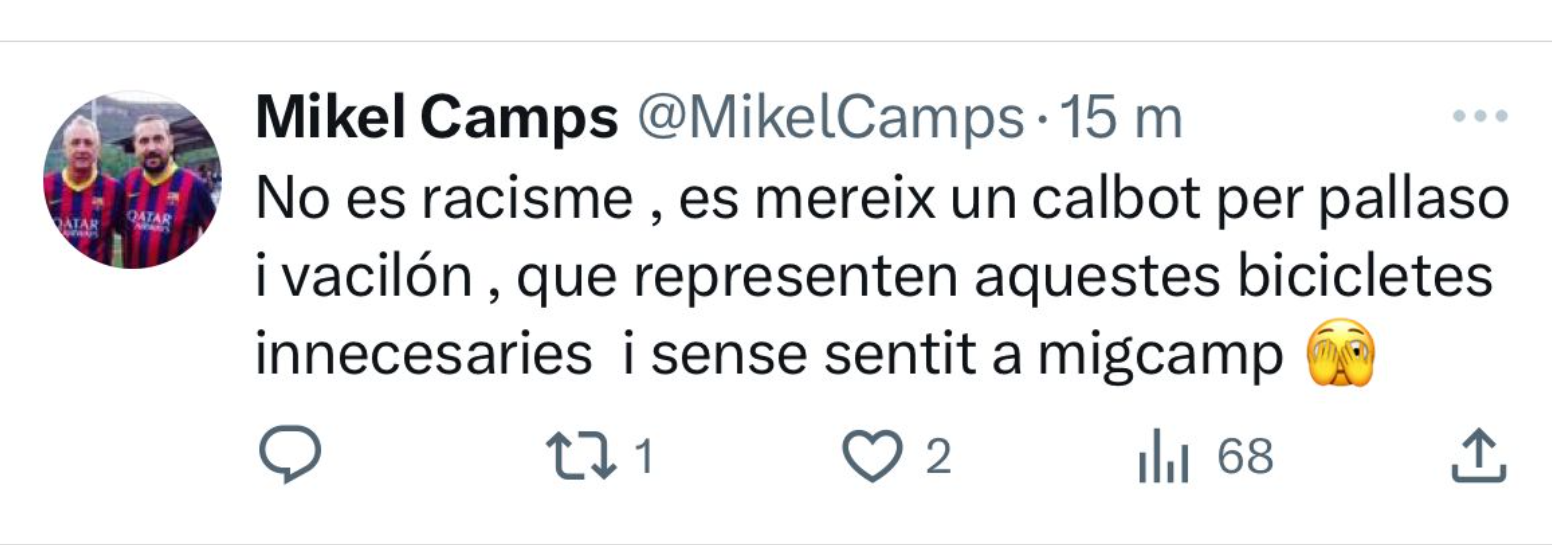 Sobre esta acción habló el portavoz adjunto de la directiva del Barcelona, Mikel Camps, que dijo en un tweet: «No es racismo, se merece una colleja por payaso y vacilón, qué representan estas bicicletas innecesarias y sin sentido en el centro del campo«. Las palabras de Camps se comentan solas. Al rato borro su vergonzoso tuit. Camps es también miembro del comité ejecutivo de la patronal catalana Pimec, que la pasada semana se posicionó a favor de la amnistía.