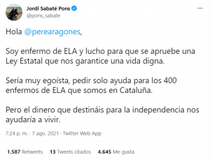 «Hola @perearagones. Soy enfermo de ELA y lucho para que se apruebe una Ley Estatal que nos garantice una vida digna. Sería muy egoísta, pedir solo ayuda para los 400 enfermos de ELA que somos en Cataluña. Pero el dinero que destináis para la independencia nos ayudaría a vivir«, ha escrito Jordi Sabaté al presidente de la Generalitat.