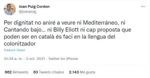 En este sentido destacamos el apoyo al boicot que ha mostrado públicamente Joan Puig, ex diputado de Esquerra y en la actualidad editor de un digital separatista quien ha asegurado en sus redes sociales que «por dignidad no iré a ver ni Mediterráneo, ni Cantando bajo … ni Billy Eliott ni ninguna propuesta que pudiendo ser en catalán se haga en la lengua del colonizador«.