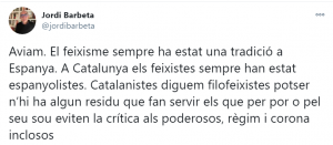 Lo demuestra el tuit que ha escrito hace unas horas donde lanza una grave acusación contra España asegurando que «el fascismo siempre ha sido una tradición en España. En Cataluña los fascistas siempre han sido españolistas«, así sin despeinarse.