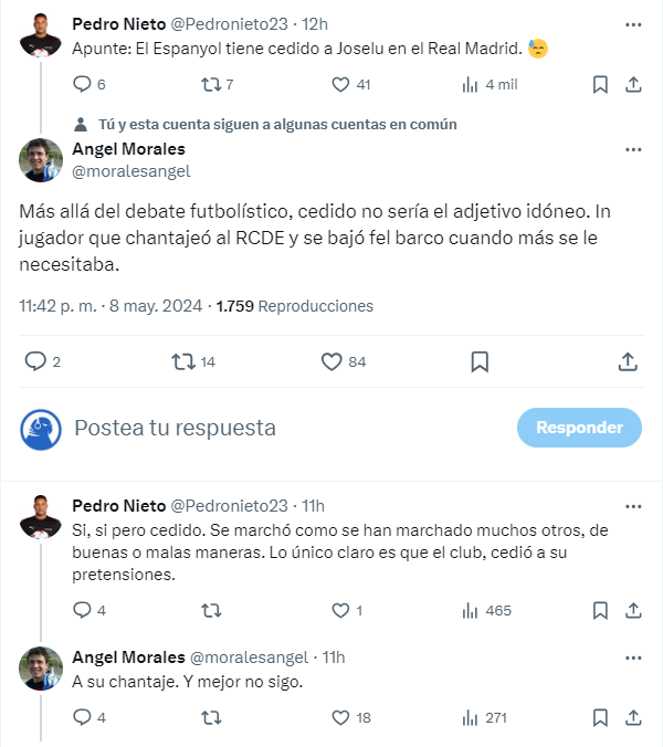 Morales, canterano que llegó a ser capitán del Espanyol, replicó que «más allá del debate futbolístico, cedido no sería el adjetivo idóneo. Es un jugador que chantajeó al RCDE y se bajó del barco cuando más se le necesitaba«.