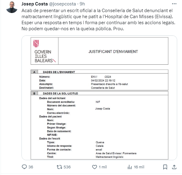 Ahora ha denunciado «maltrato lingüístico» en la Sanidad de las Islas Baleares, y por ello ha interpuesto una queja ante el ejecutivo balear, según ha denunciado en su cuenta de X. «Acabo de presentar un escrito oficial a la Consejería de Salud denunciando el maltrato lingüístico que he sufrido en el Hospital de Can Misses (Ibiza). Espero una respuesta en tiempo y forma para continuar con las acciones legales. No podemos quedarnos en la queja pública. Basta«.
