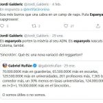 Y llega a extremos delirantes, como afirmar «puto Valverde y puta España«, atacando al entonces técnico del Barça y a nuestro país, al alimón. En la galería de imágenes que acompaña esta información se encontrarán un breve muestrario de los ataques a nuestro país que Galderic tenía en su timeline en el momento de escribir esta pieza.