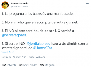 Además Cotarelo acusa de «manipulación» a la dirección de Junts en la pregunta a la militancia del partido. Por el momento el prófugo Carles Puigdemont no se ha posicionado en la votación que concluye este miércoles a las 13:00 horas. Otros miembros del partido, como la portavoz del Govern, Meritxell Budó ya ha anunciado su voto afirmativo.