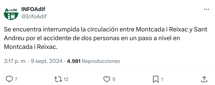 Este lunes ha sido un día trágico en Montcada i Reixac, donde se ha producido un atropello en la línea R2 a la altura de la ciudad vallesana. Una joven de 16 años ha fallecido tras ser arrollado por un convoy que circulaba destino a Barcelona. En el accidente se habría visto implicada una segunda persona, según informa Adif.