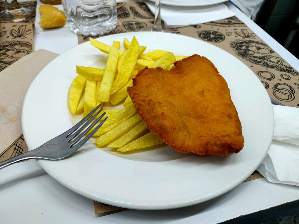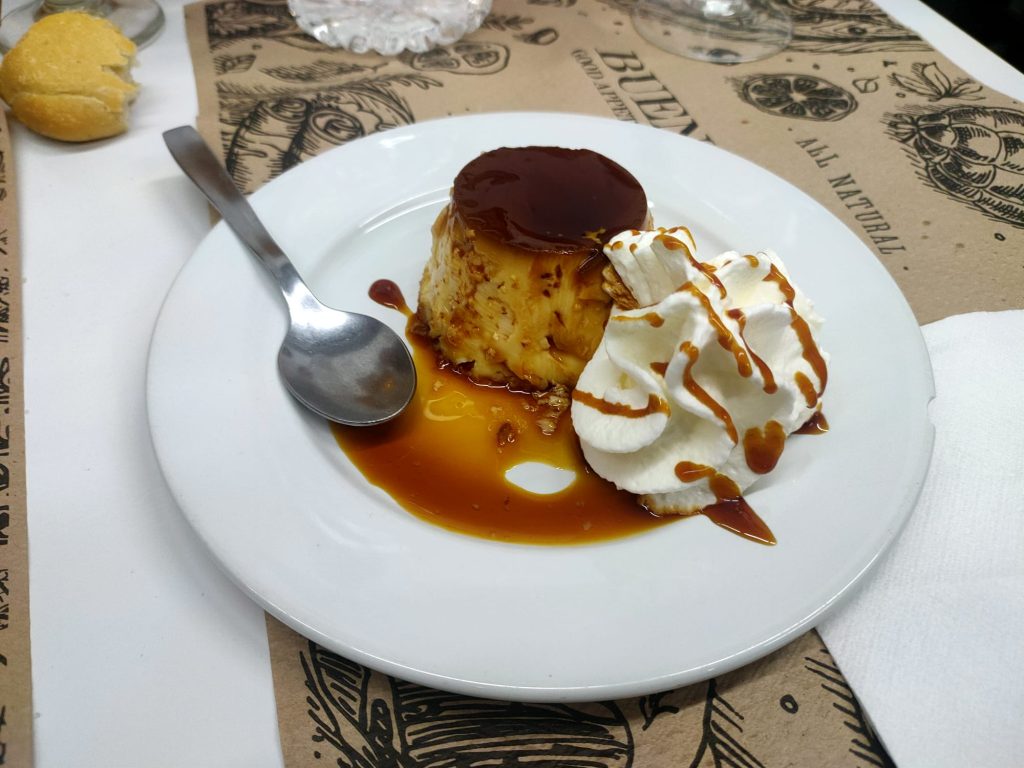 De segundo, cachopo de lomo de cerdo con patatas fritas. Las patatas fritas caseras, de las que comía de chaval en casa cuando nos quedaban bien. Buenísimas. Y el lomo estaba bien empanado, sin ser aceitoso y con el toque justo de jamón y queso. De postre, un buen flan de huevo, mejor que otros por los que he pagado cinco o seis euros fuera de menú en restaurantes de medio pelo.