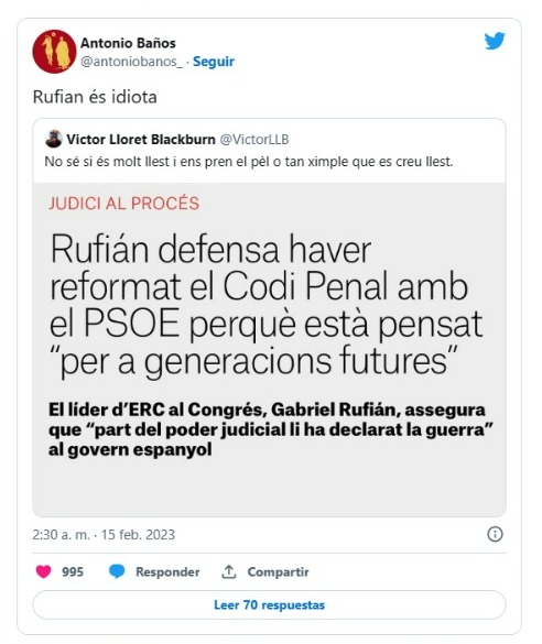 Este miércoles, el periodista declaradamente secesionista Antonio Baños — fue diputado de la CUP — ha insultado a Rufián a través de su cuenta de Twitter, donde lo tacha de «idiota«. El líder de Esquerra en Madrid defendió haber reformado el Código Penal con el PSOE porque está pensado «para generaciones futuras. No fue una negociación ni una reforma pensada para esa generación«.