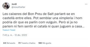Navegando por las redes secesionistas nos hemos encontrado con un mensaje que demuestra el grado de obsesión que algunos han alcanzado con el idioma. Un profesor gerundense, así lo destaca al menos en su biografía de Twitter, ha denunciado que dos cajeras de los supermercados Bonpreu de Salt, hablaban entre ellas en castellano. Ya no tienen suficiente en denunciar públicamente cuando hablan castellano dirigiéndose a los clientes, ahora también se indignan y las señalan por hablar el idioma común entre ellas. A este punto de obsesión y de imposición estamos llegando.