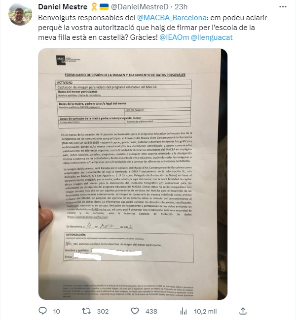 «Estimados responsables del @MACBA_Barcelona: ¿me pueden aclarar porqué su autorización que he de firmar para la escuela de mi hija está en castellano? ¡Gracias! @IEAOm @lenguacat«, escribía indignado este profesor.