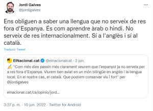 «Nos obligan a saber una lengua que de nada sirve fuera de España. Es cómo aprender árabe o hindi. De nada sirve internacionalmente. Sí al inglés y sí al catalán«, ha afirmado Galves en sus redes sociales, un mensaje que se ha convertido en viral y en la mofa de Twitter.