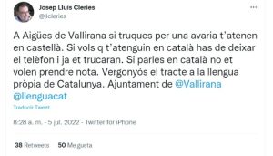 «En Aigües de Vallirana si llamas por una avería te atienden en castellano. Si quieres q te atiendan en catalán debes dejar el teléfono y ya te llamarán. Si hablas en catalán no quieren tomarte nota. Vergonzoso el trato a la lengua propia de Cataluña. Ayuntamiento de @Vallirana @lenguacat«, ha afirmado Cleries.