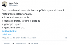 «Cómo cambian los usos del espacio público cuando los bares y restaurantes están cerrados: más interacción espontánea, más gente en los parques, jardines y playas, más gente paseando, y más gente haciendo ejercicio«, sentenció Jofra.