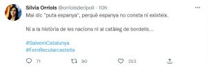 «Nunca digo «puta Espanya», porque España no consta ni existe. Ni en la historia de las naciones ni en el catálogo de burdeles«, ha afirmado Orriols en su cuenta de Twitter.
