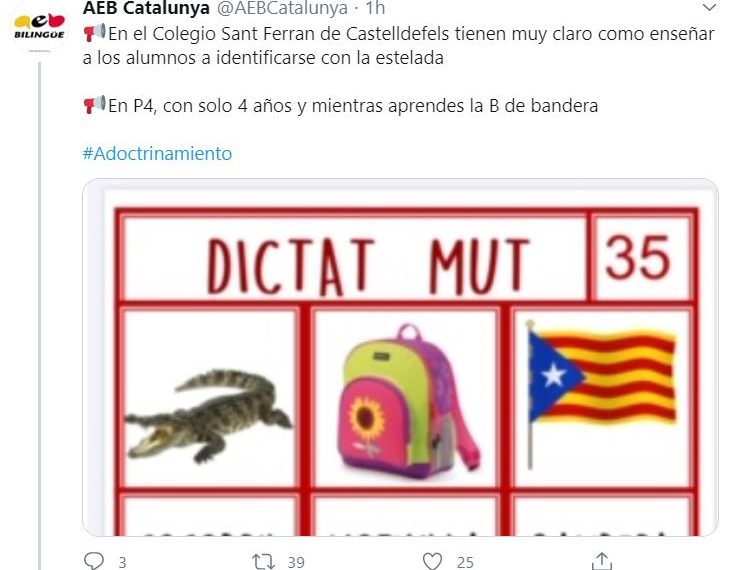 Y añaden que «en P4, con solo 4 años y mientras aprendes la B de bandera». La ilustración que acompaña el ‘dictat mut’ [dictado mudo] para identificar dicha letra es una bandera ‘estelada’.