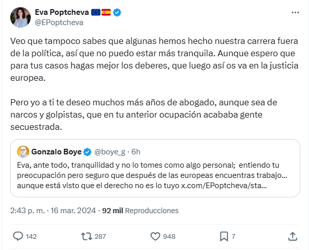 A través de su cuenta en X ha tratado de hacerse el gracioso con el futuro de una eurodiputada de CS, y se ha encontrado con una respuesta que se ha hecho viral. «Eva, ante todo, tranquilidad y no lo tomes como algo personal; entiendo tu preocupación pero seguro que después de las europeas encuentras trabajo… aunque está visto que el derecho no es lo tuyo«, le ha espetado Boye a Eva Poptcheva.
