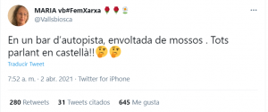 Este viernes nos encontramos en las redes sociales la campaña iniciada por una declarada independentista en la que asegura que en el bar de una autopista se ha encontrado un grupo de Mossos que entre ellos hablaban castellano.