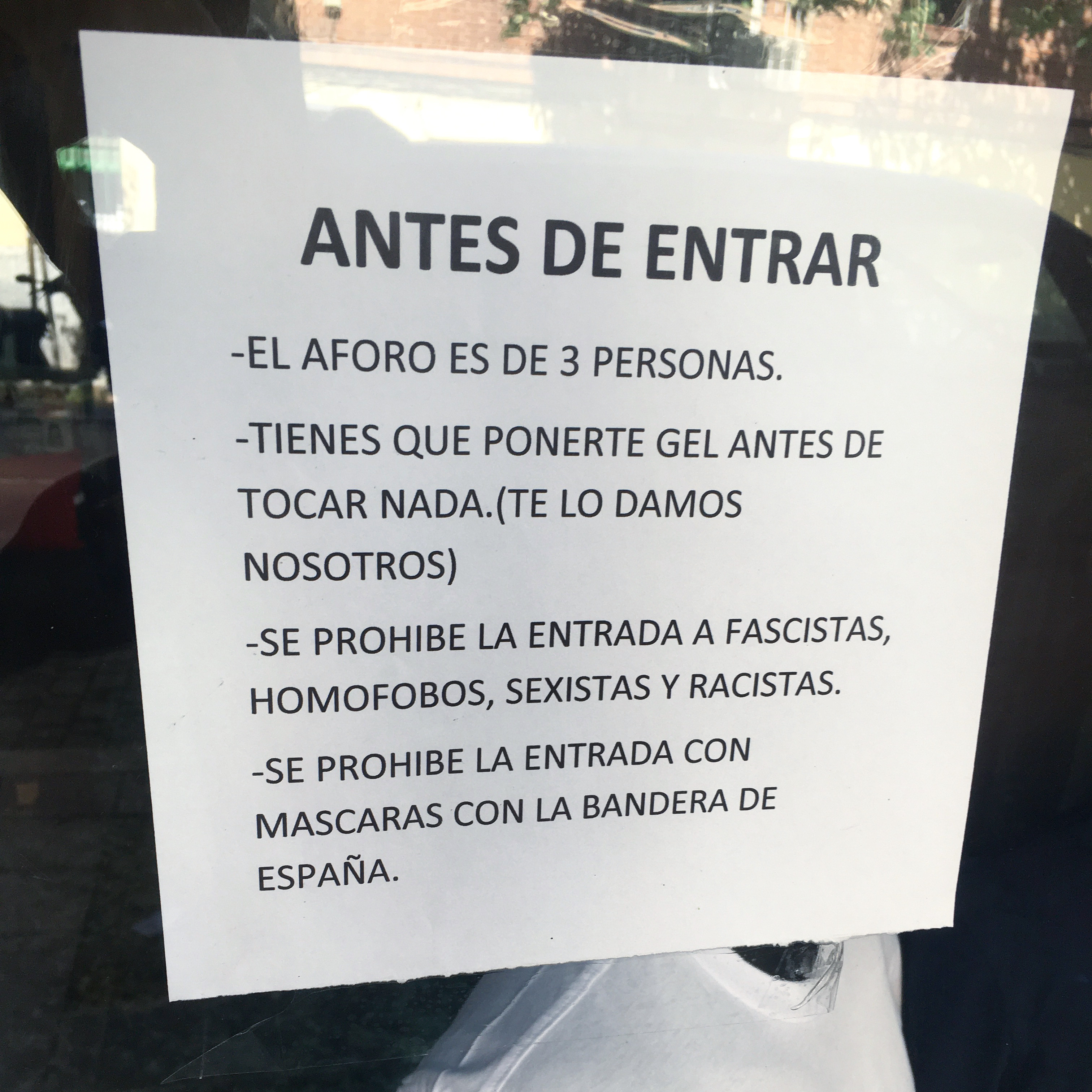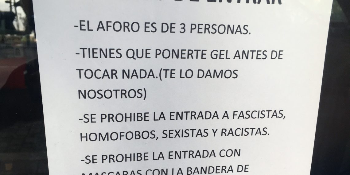 La tienda Bestiario Shop, situada en el madrileño barrio de Vallecas, prohíbe la entrada a cualquier persona que lleve una mascarilla con la bandera de España. Así lo anuncian en un cartel situado en la puerta de su negocio.