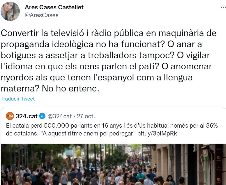 «¿Convertir la televisión y la radio pública en maquinaria de propaganda ideológica no ha funcionado? ¿O ir a tiendas a acosar a trabajadores tampoco? ¿O vigilar el idioma que usan los niños en el patio? ¿O llamar ‘ñordos’ a los que tienen el español como lengua materna? No lo entiendo», argumenta. Simple y claro. La imposición y la amenaza siempre consiguen un efecto rebote.