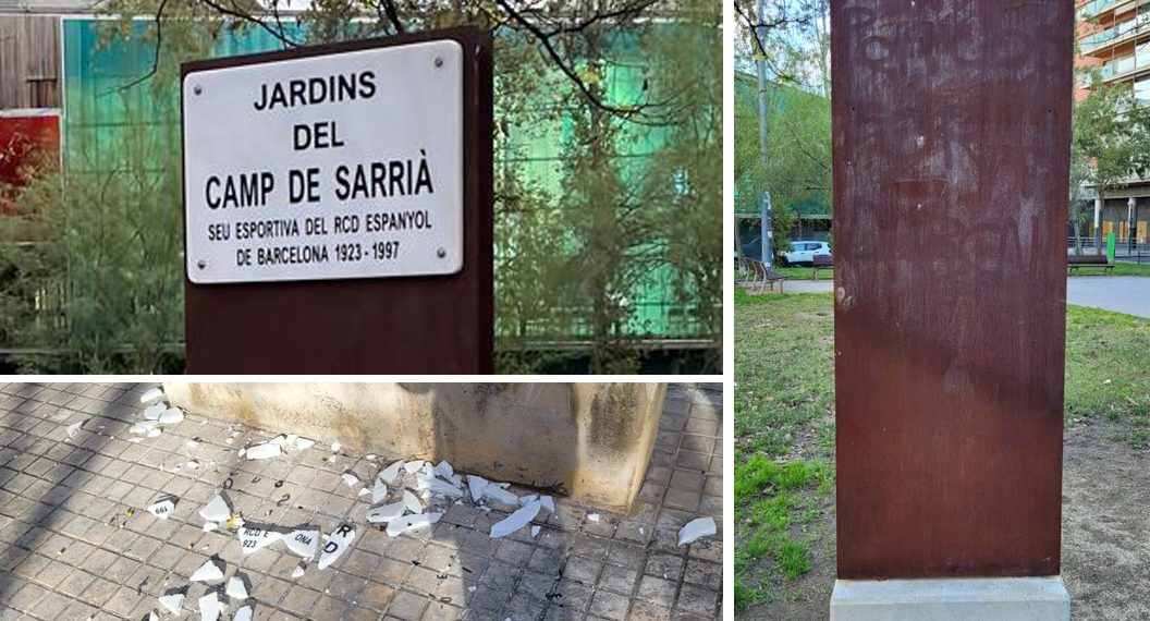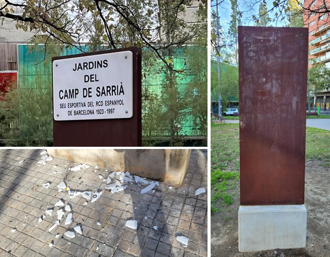 Lamentablemente este pasado martes, y gracias a una información de ‘La Grada’, hemos podido conocer que unos vándalos han destrozado el modesto recuerdo que había instalado el consistorio barcelonés donde se encontraba el antiguo estadio de Sarriá. Una placa exactamente igual a las que sostienen la nomenclatura de las calles de Barcelona y en la cual se podía leer ‘Jardines del campo de Sarria‘ y debajo ‘Sede deportiva del RCD Espanyol de Barcelona 1923-1997‘.