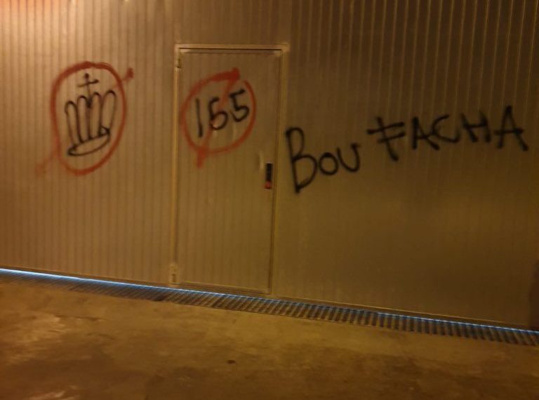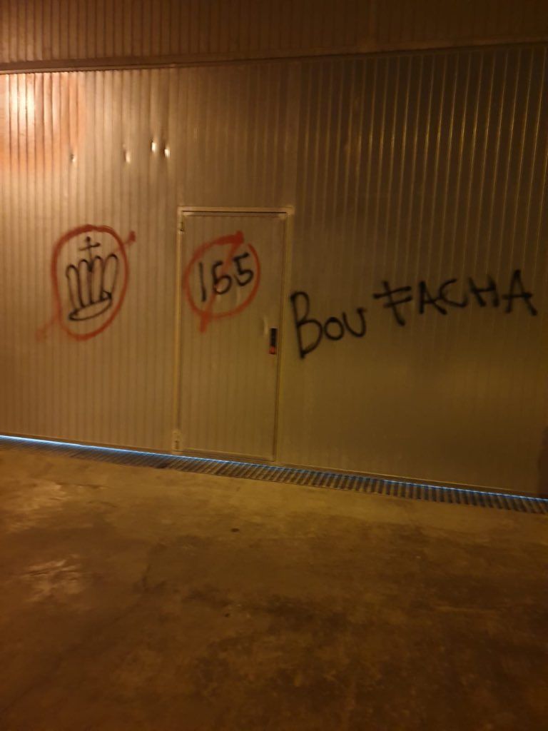 Los radicales han señalado con pintadas la fachada de la empresa de Bou con lemas como «Bou facha» o «El fascismo no prescribe». Todo ello adornado con esteladas y pintadas en favor de la independencia.