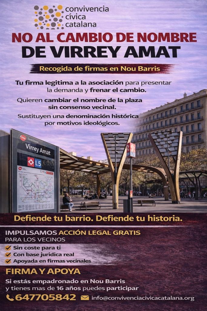 Convivencia Cívica Catalana, entidad que preside Ángel Escolano, ha iniciado una campaña de recogida de firmas para evitar que el Ayuntamiento de Barcelona, por motivos ideológicos, cambie el nombre de la popular plaza «Virrey Amat», proceso que no cuenta con el consenso vecinal.