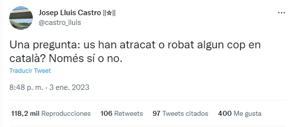 Buceando en las redes independentistas, nos hemos encontrado con una nueva bufonada que se ha convertido en viral y que ha dejado en ridículo al autor de tal ‘hazaña’. La cuenta de @catro_lluis ha tenido la ‘brillante’ idea de lanzar una pregunta a través de su cuenta de Twitter donde lanza la siguiente cuestión a sus seguidores «Una pregunta: ¿os han atracado o robado alguna vez en catalán? Solo sí o no«.