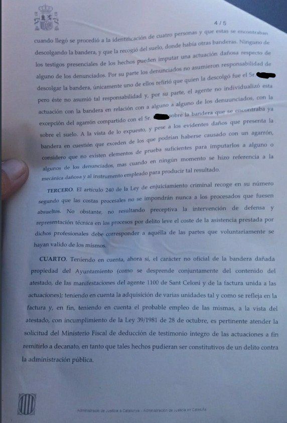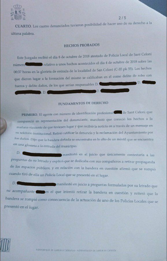 Se ha hecho pública la sentencia del juicio que se celebró el pasado 9 de octubre en los juzgados de Granollers (Barcelona) contra cuatro personas acusadas de retirar propaganda secesionista de la vía pública, concretamente en Sant Celoni.