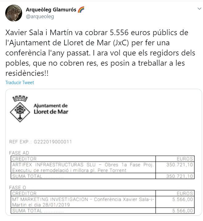 El popular tuitero @arqueoleg, más conocido como ‘Arqueòleg Glamuròs, ha difundido un documento municipal en redes sociales en el que se refleja la cantidad a cobrar por Sala-i-Martín.