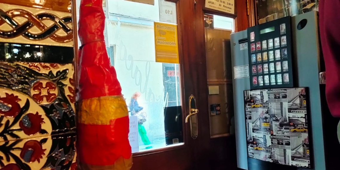 Una de las tascas más típicas de Madrid, Malacatín, que está en la zona del monumento a Cascorro (calle de la Ruda), tiene en su puerta un curioso ornamento. En estos momentos de confinamiento, en el que tanto añoramos el compartir con los seres queridos manteles en bares y restaurantes, no está de más relatarlo.