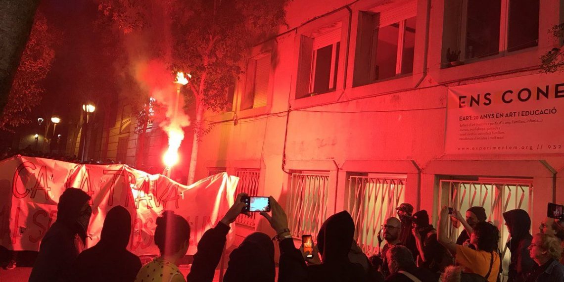 Una parte de los manifestantes han roto cristales de entidades bancarias, hoteles y comercios. También han hecho barricadas con los contenedores y han pintado la sede del PDECAT de Gracia.