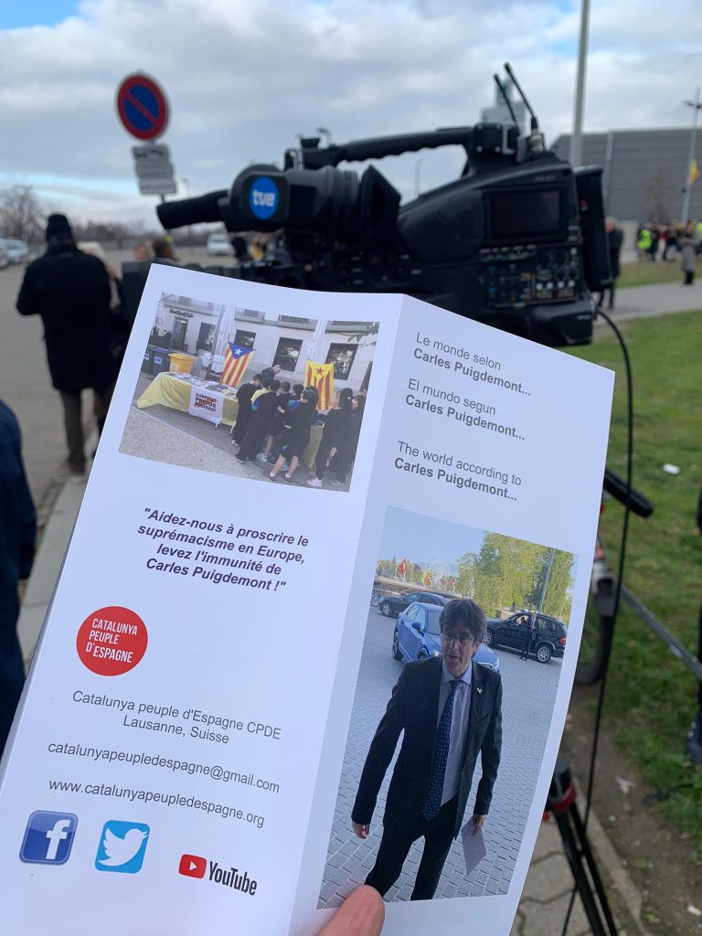 François Meylan, líder de la plataforma antisecesionista Catalunya Peuple d’Espagne, le entregó a Carles Puigdemont, al que considera un «delincuente» y un «supremacista», un folleto en el que se pide que el Parlamento Europeo le retire la inmunidad.
