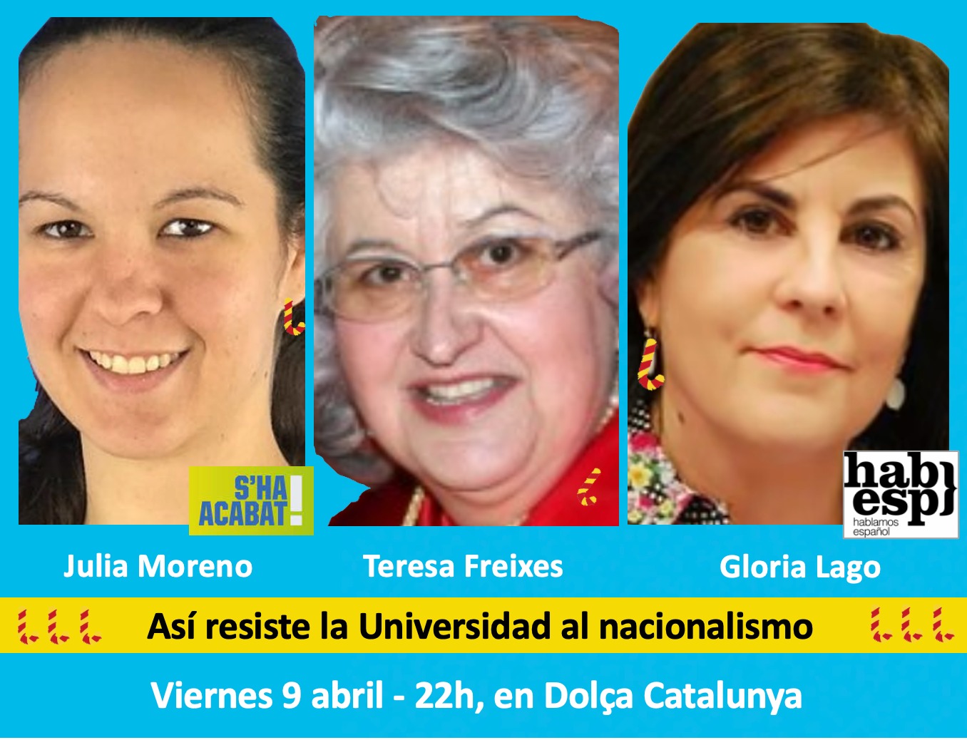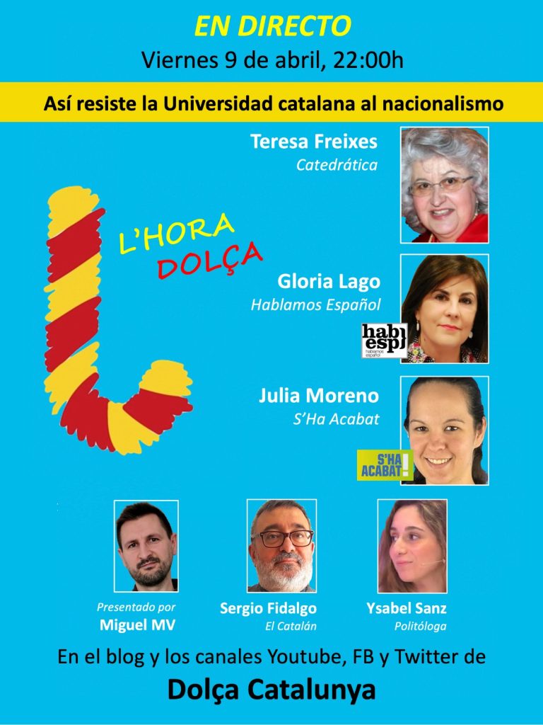 La tertulia vía streaming ‘L’Hora Dolça’, de Dolça Catalunya, emitirá el viernes 9 de abril, a partir de las 22:00, un programa especial dedicado a la Resistencia en las universidades al nacionalismo que se podrá seguir en las redes sociales de este portal y en su canal de Youtube.