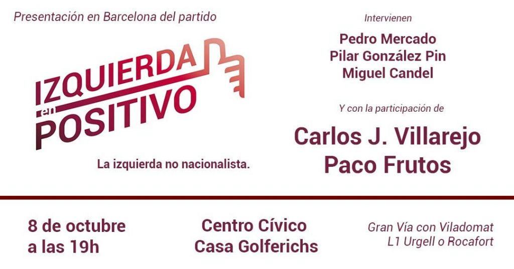 El 8 de octubre a las 19:00 se presentará en Barcelona el partido Izquierda en Positivo: La izquierda no nacionalista. En el acto intervendrán el ex fiscal Carlos Jiménez Villarejo y el ex secretario general del PCE Paco Frutos.