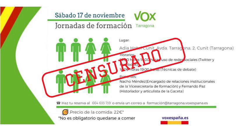 «En el intento de hacer las Jornadas de formación de VOX que se harán en todas las provincia de España el 17 de Noviembre, VOX Tarragona a la hora de establecer un lugar para hacer su jornada de formación provincial, ha sufrido dos boicots en menos de una semana: una por presiones de los CDR en el hotel la Selva del Camp y la otra, por presiones institucionales (el concejal de Seguridad Ciudadana del municipio de Cunit, Ivan Faccia Serrano, ERC, junto con el concejal de Actividad Económica, Xavier Salvadó Usach, Guanyem Cunit) en el Adia hotel de Cunit.