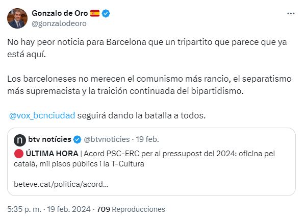 Gonzalo de Oro, presidente del grupo municipal de VOX en el Ayuntamiento de Barcelona, ha dicho que “votamos en contra de los presupuestos de Collboni porque representan un modelo de ciudad que le gusta al separatismo de ERC y recuerda al modelo comunista de Ada Colau”. Ayer ERC, PSC y Comunes votaron a favor del proyecto de presupuestos en la Comisión de Economía, y por lo tanto siguen su andadura hasta que sean aprobados en el pleno municipal.