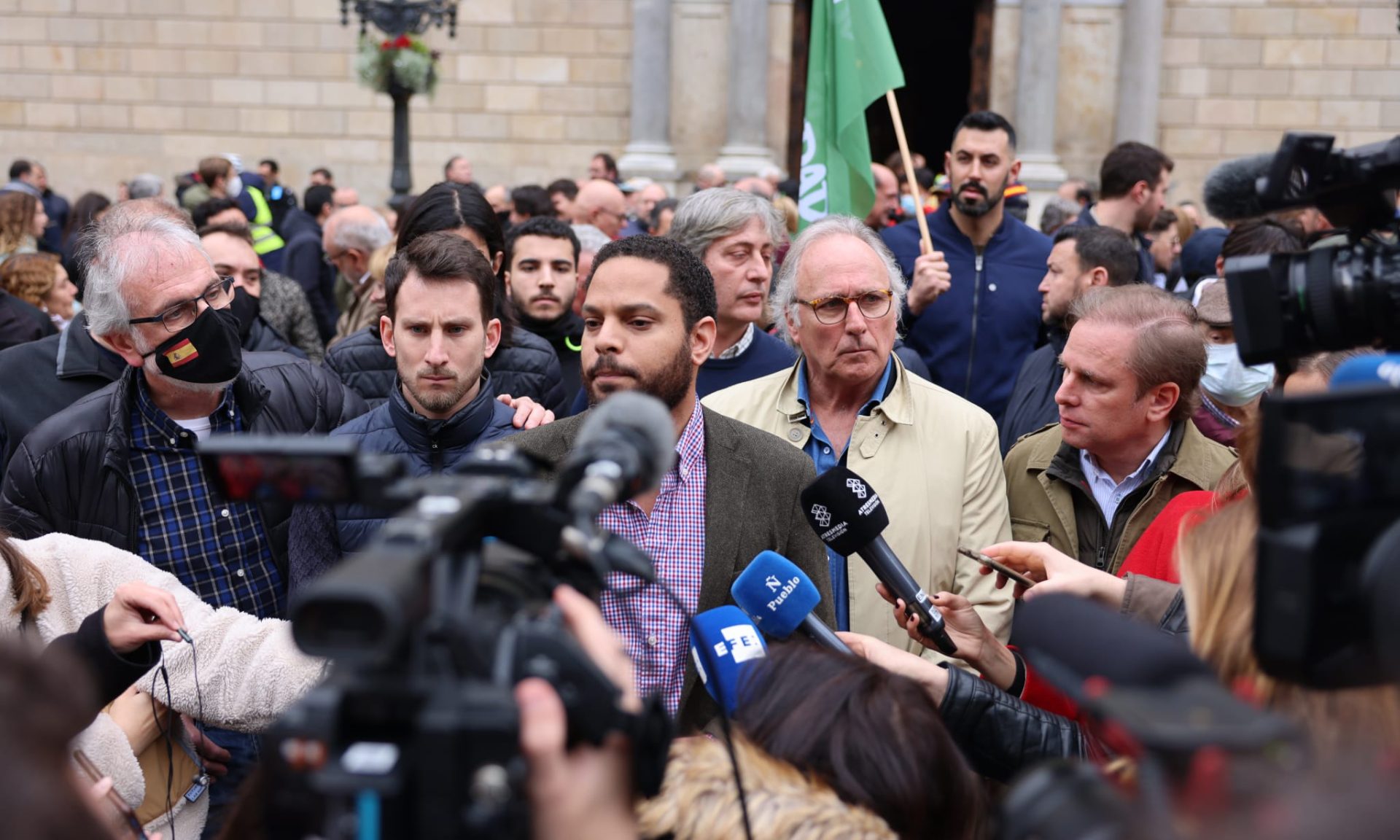 Al acto, delante del ayuntamiento de la capital, también han asistido el portavoz de VOX en el Parlament, Joan Garriga, el portavoz adjunto Antonio Gallego y los diputados del Congreso Juan José Aizcorbe y Juan Carlos Segura, entre otros diputados de la formación.