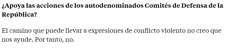A la pregunta «¿Apoya las acciones de los autodenominados Comités de Defensa de la República?» el líder de Catalunya en Comú contestó en el diario del Grupo Godó que «el camino que puede llevar a expresiones de conflicto violento no creo que nos ayude. Por tanto, no».