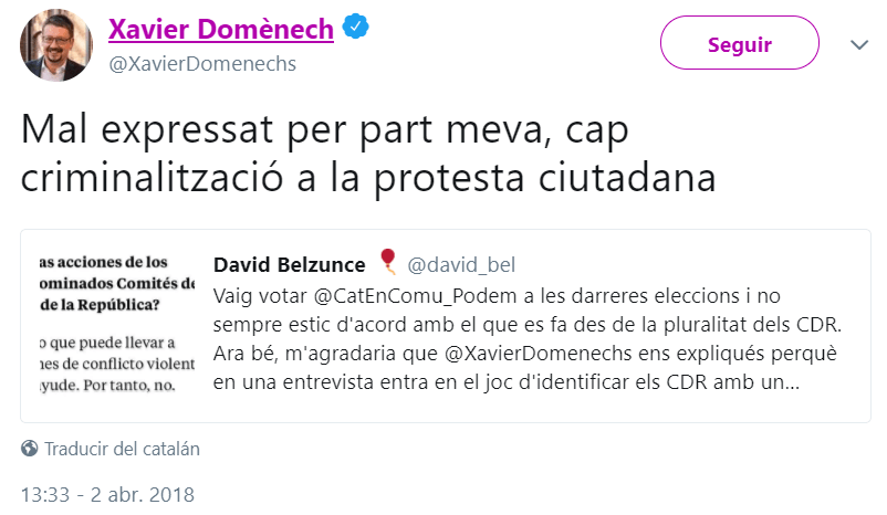 Doménech decidió contestar a un tuitero que colgó el siguiente mensaje: «Voté Catalunya en Comú Podem en las últimas elecciones y no siempre estoy de acuerdo con lo que se hace desde la pluralidad de los CDR».